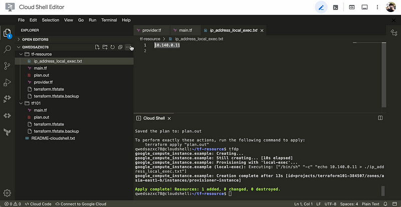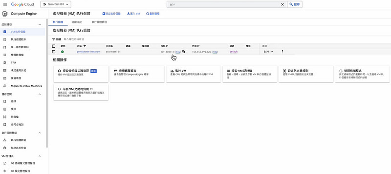 這個 Terraform 配置碼的目的是創建一個 Google Cloud Compute Engine 實例,並用 Provisioners 在基礎架構建立後執行各種本機操作,以實現特定的配置或後續處理。在此示例中,local-exec Provisioner 用於成功地將虛擬機器的 IP 地址記錄到本機文件,我們會拿到 10.140.0.11,可以跟雲端機器的私有網路地址 private ip address對照是相同的。