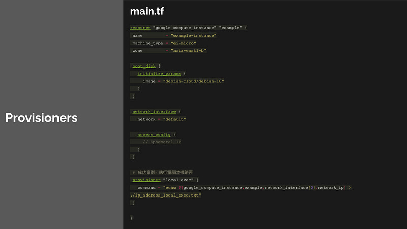 代碼示例中的 Provisioners 部分用於執行特定的本機操作,它們在創建 Google Compute Engine 虛擬機器實例後執行。在這邊的範例中,我們會主要使用 local-exec(本機執行),以下是它們的功能和說明: