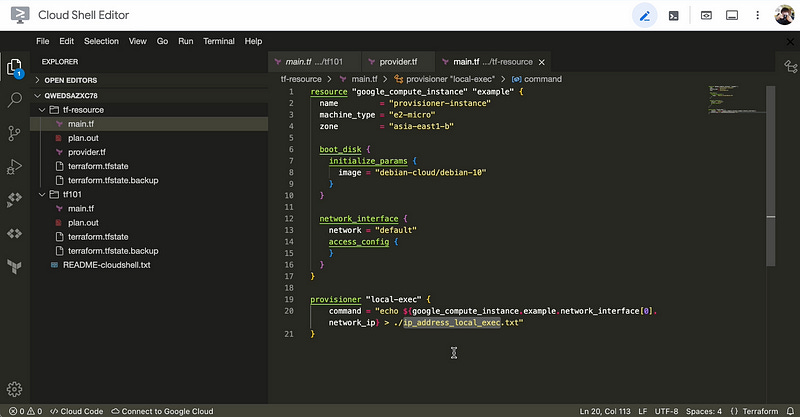 實際操作:在 GCP 的 Cloud Shell 中,我們創建了一個 Google Compute Engine(GCE)虛擬機器實例。使用 local-exec Provisioner 在虛擬機器建立後,在本機機器上執行命令,以記錄虛擬機器的 IP 地址。通過執行