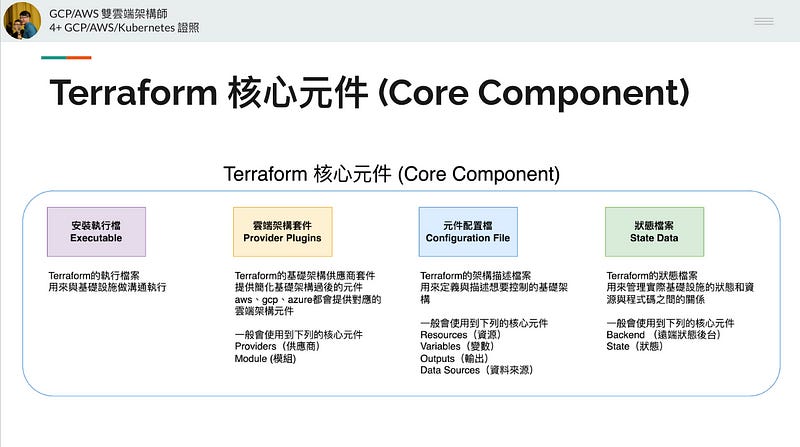 與 Terraform init / fmt / validate / plan / apply / destroy 指令各自代表的意義。Terraform 核心元件 (Core Component):了解四種個流程的各自定位,