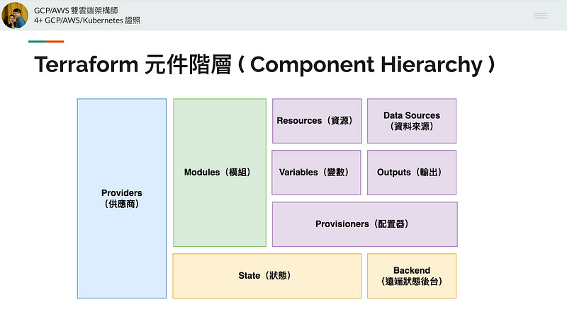 與 Terraform init / fmt / validate / plan / apply / destroy 指令各自代表的意義。Terraform 元件階層 ( Component Hierarchy ):元件階層用來理解terraform裡面所有不同元件的用途與階層。