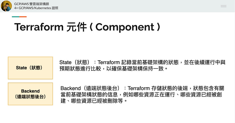 一般會使用下列的核心元件:State(狀態)、Backend(遠端狀態後台)