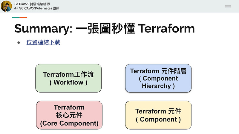在一張圖秒懂 Terraform 中,首先點選位置連結下載這張秒懂 Terraform的圖片,我們會分別介紹4個最重要的 Terraform 核心概念。