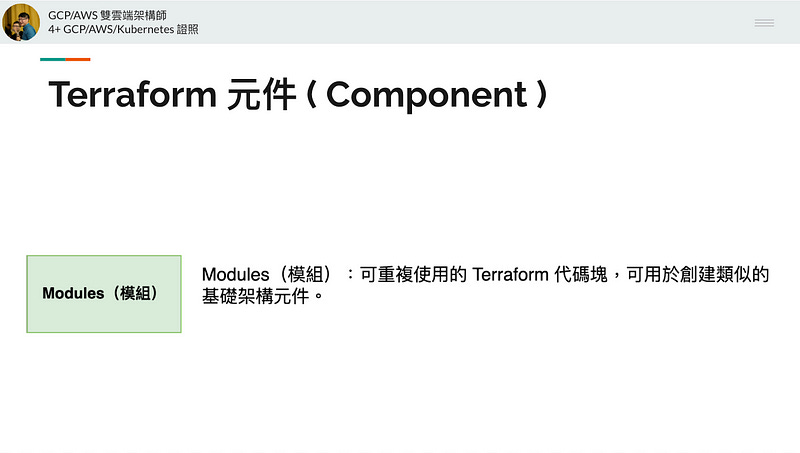 Modules(模組):可重複使用的 Terraform 代碼塊,可用於創建類似的基礎架構元件。