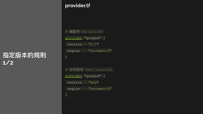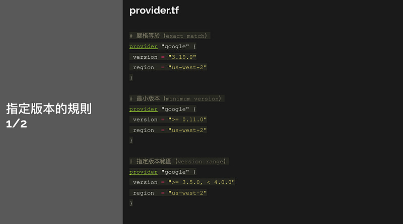 - 任何版本(any version):接受任何版本。Terraform 最佳實踐:確保 Terraform 配置使用特定版本的提供者,以確保功能的穩定性和相容性。