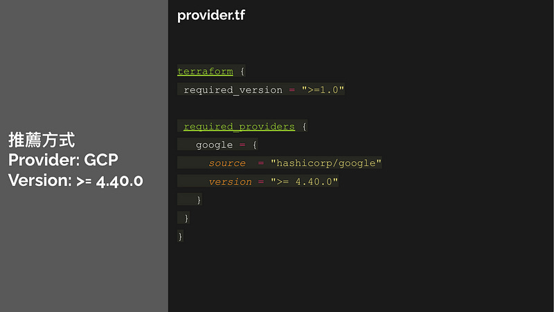 required_providers { google = { source = "hashicorp/google" version = ">= 4.40.0" } },這表示你的 Terraform 配置需要使用 Google 提供者的版本 4.40.0 或更高版本。這可以確保你的 Terraform 配置在使用 Google Cloud 服務時擁有所需的功能和相容性。