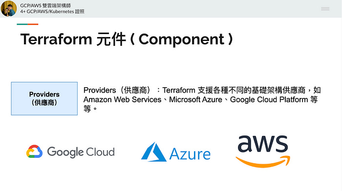 Providers(供應商):Terraform 支援各種不同的基礎架構供應商,如 Amazon Web Services、Microsoft Azure、Google Cloud Platform 等等。